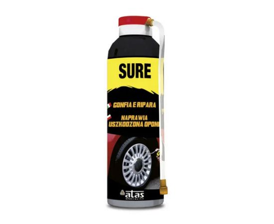 Sprej Atas Sure za brzu privremenu popravku probušene gume automobila, motocikla i bicikla, bez skidanja točka. Vrlo korisno priručno sredstvo u neočekivanim situacijama.